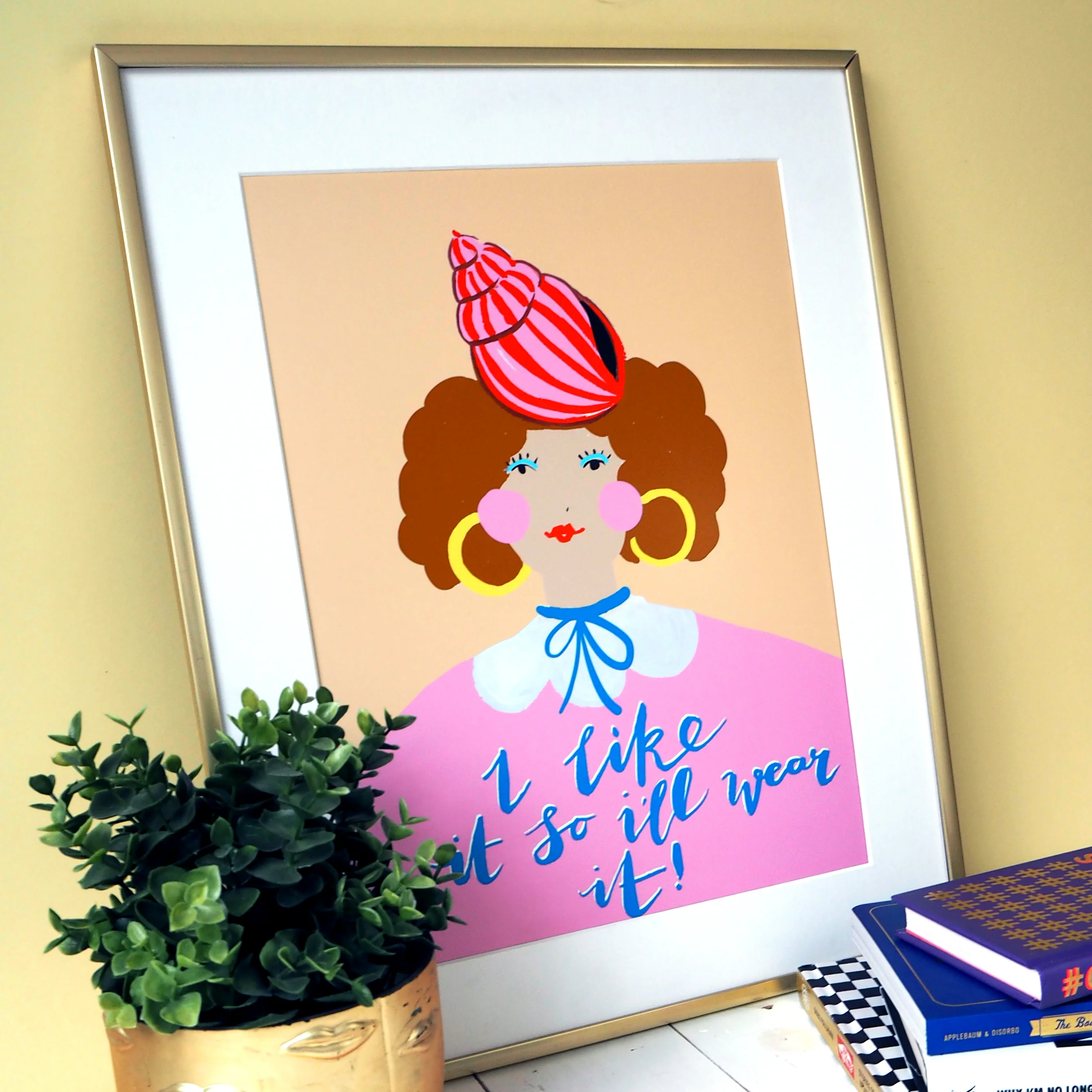"I Like It So I'll Wear It!" typography print featuring a portrait of a woman with a jazzy hat, set against a trendy peach background.