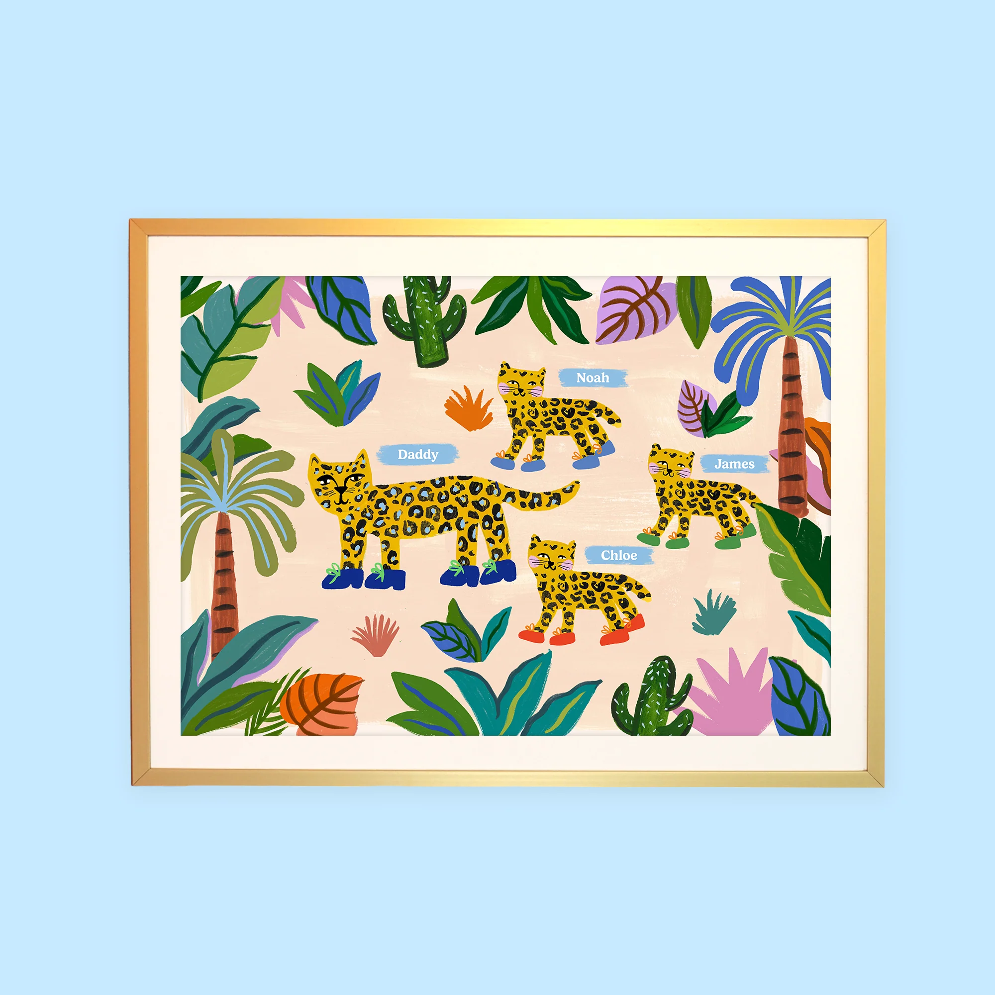 This print makes a wonderful present for mums and dads on special occasions. Set against a blush pink background, the palms print gives it a tropical feel and features a cute leopard family which can be personalised to match your own lovely family.