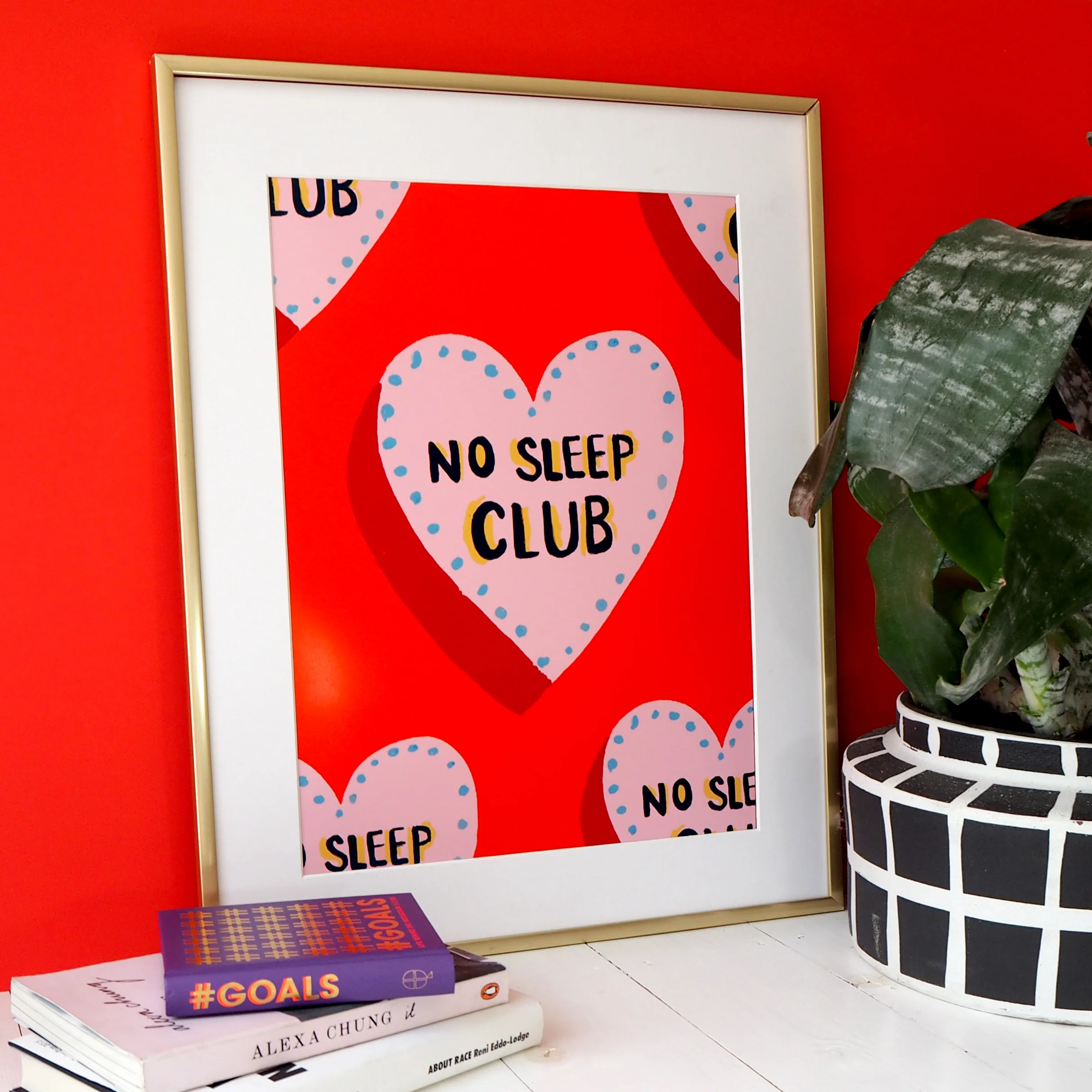 From our beautiful new range, we've created a busier print of our bestselling 'No Sleep Club'. Now available as a repeat pattern-style print set against a vibrant red background.