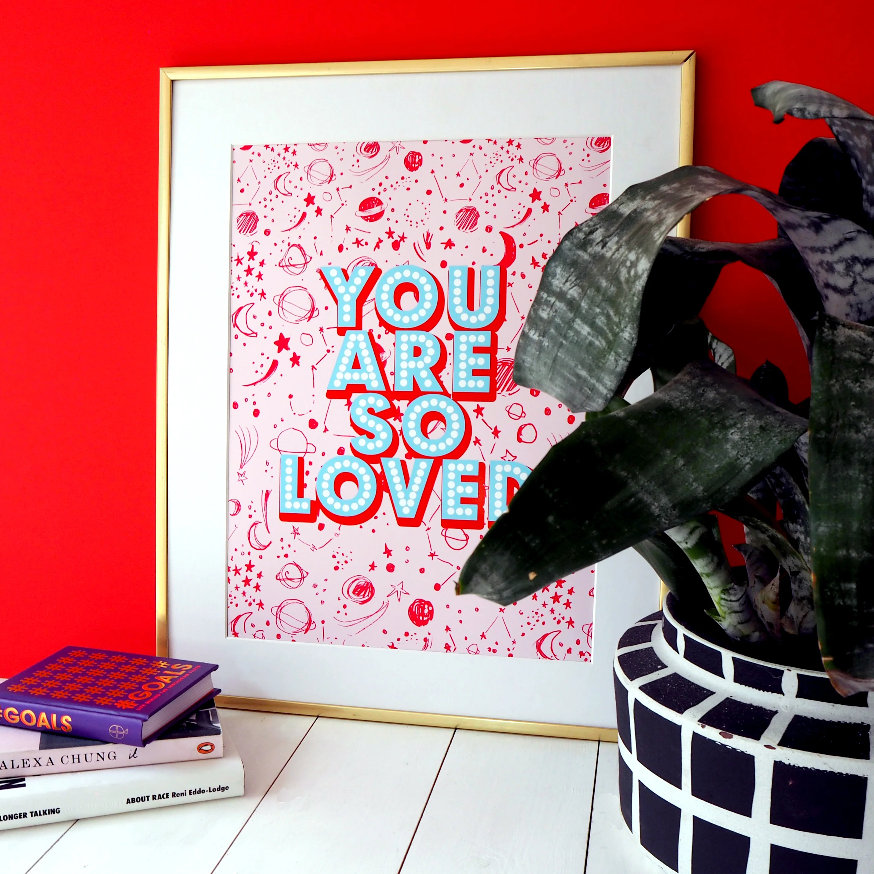 From our beautiful new range, 'You Are So Loved' is a beautiful typography print, written out in bold lettering in a blue and red, set against a pink space pattern background.